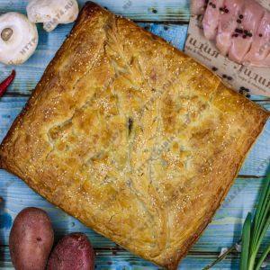 Пирог из слоеного теста с филе курицы, грибами и картофелем