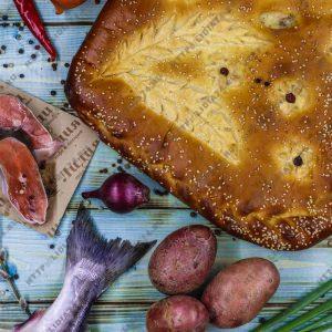Пирог из сдобного теста с филе горбуши и картофелем
